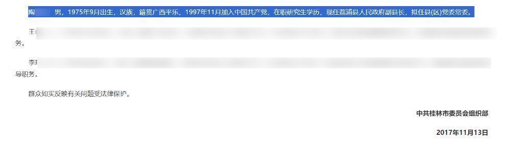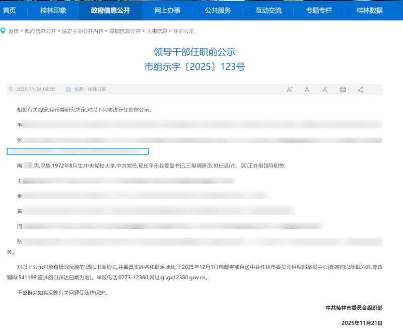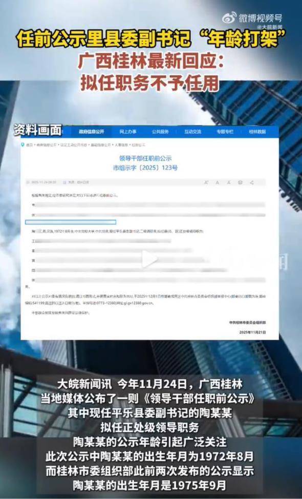 今年11月24日,广西桂林当地媒体发布了一则《领导干部任职前公示》,发布单位是桂林市委组织部,落款时间为2025年11月21日。上述公示中共有8人拟任新职,其中陶某某的年龄,竟然比此前公示的大了3岁,引发舆论关注。
