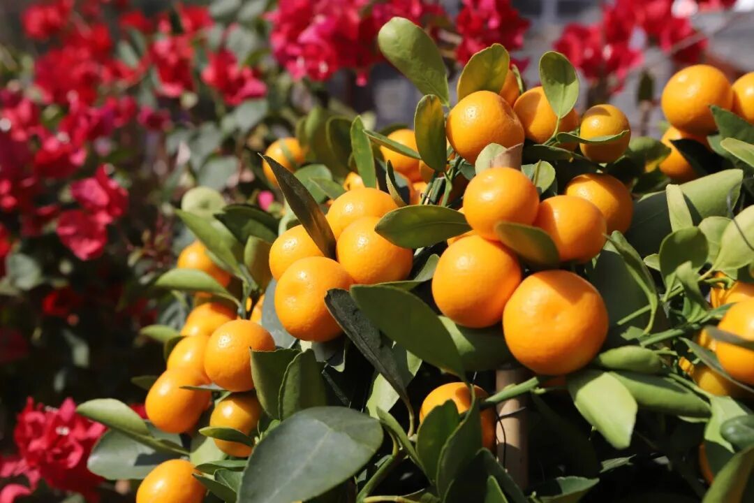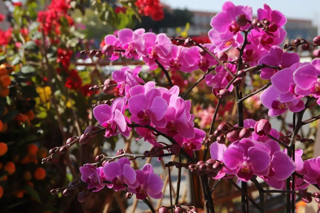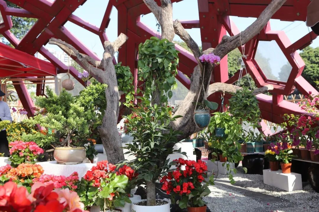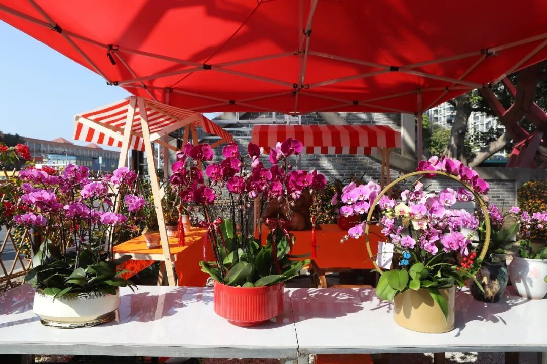 应节年宵花品类齐全,蝴蝶兰、蕙兰、三角梅、玫瑰海棠、年桔、红掌、金豆等悉数登场,竹柏、发财树等小巧玲珑的小盆栽备受青睐。